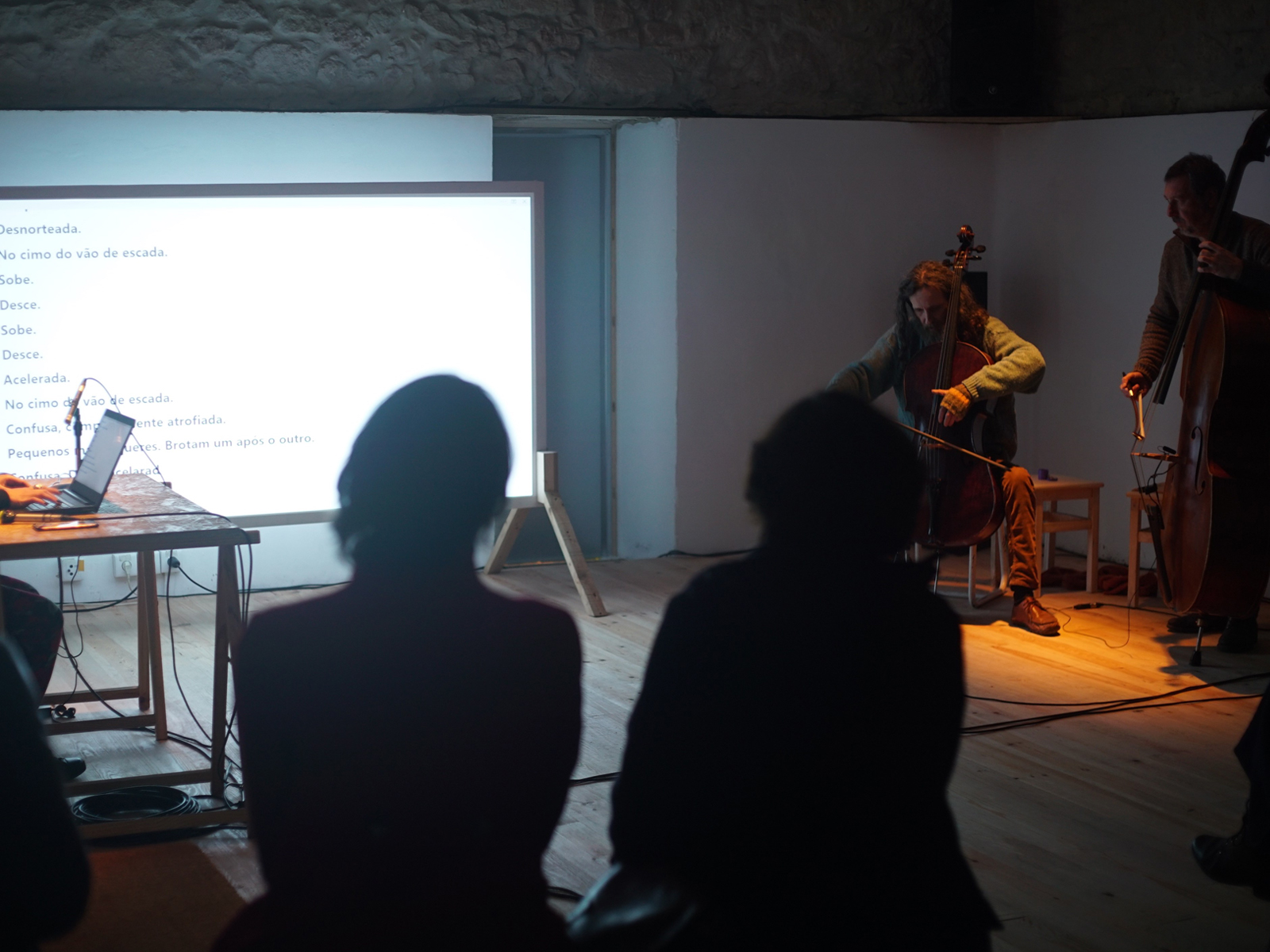 The trio consists of Hernâni Faustino (who skillfully gives life to the double bass), Miguel Mira (who brings the cello and leaves countless stories in the resonance of the strings), and Margarida Azevedo (who plays keyboards projecting words onto a canvas). The challenge was initiated by her. The desire to make (Diz)Sonâncias a true synergy between sounds and words drove her to dive headfirst into a bottomless well of possibilities and collaborative efforts.