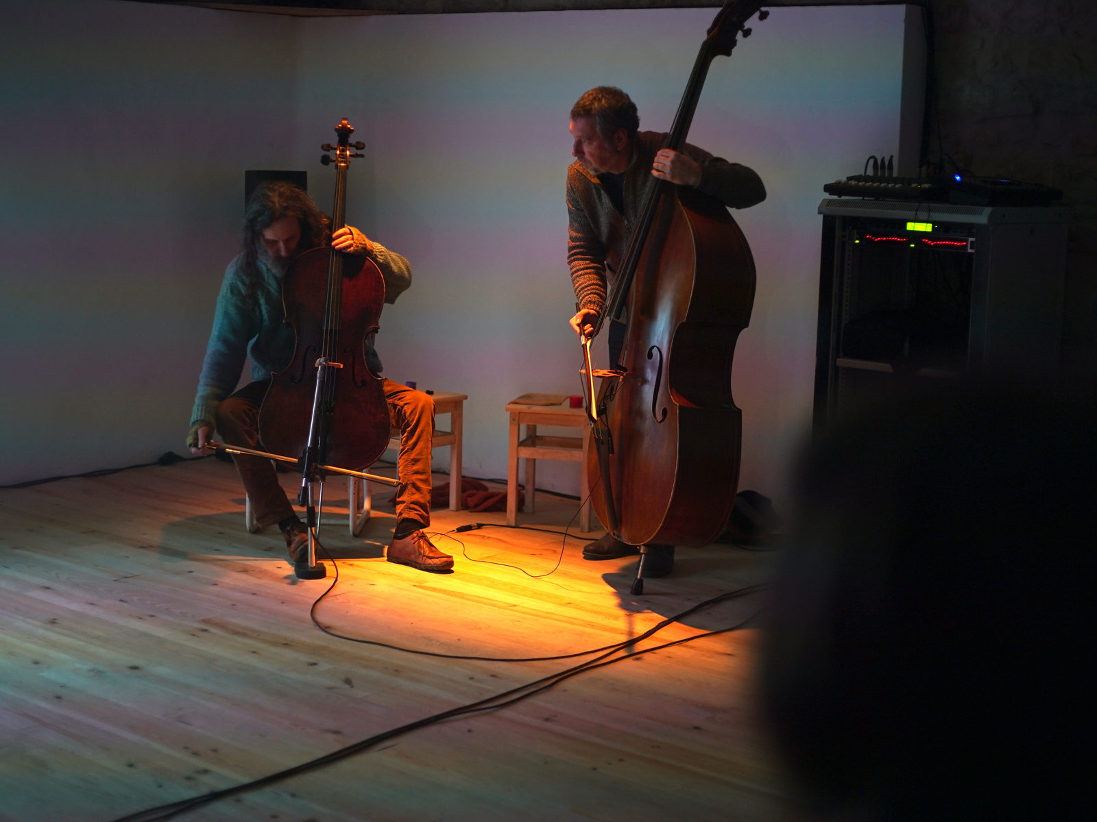For the 3rd Open Day, we will have two concerts and a dinner from our neighbor in A-dos-Francos, Chef José Roseira. In the first concert, a group that combines free improvisation with real-time text writing. The TextuAlive trio, featuring Margarida Azevedo (text), Hernâni Faustino (double bass), and Miguel Mira (cello), will present the work developed during their residency at OSSO at 5:30 PM. After dinner, we will have a concert by Diogo Alvim and Matilde Meireles. Following their performance the previous night at the Convento de São Francisco in Coimbra, they will explore the sound materials from the “Campo Próximo” sound installation. This installation uses field recordings from selected locations between São Gregório and Convento São Francisco, where it was first presented.