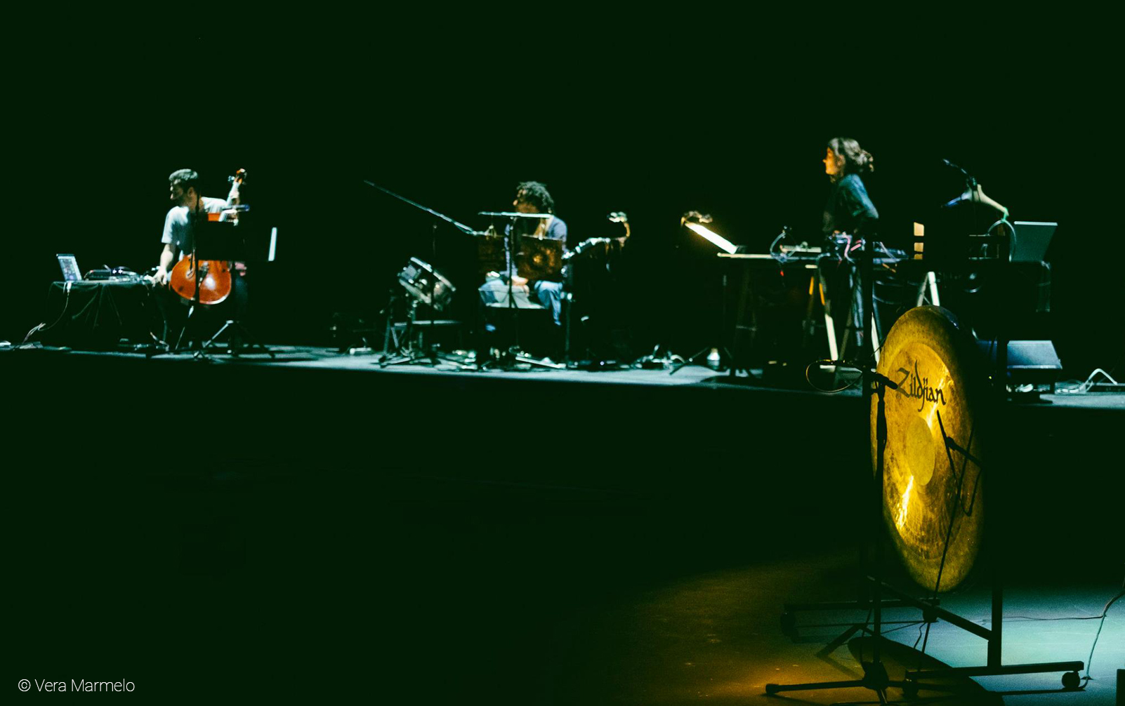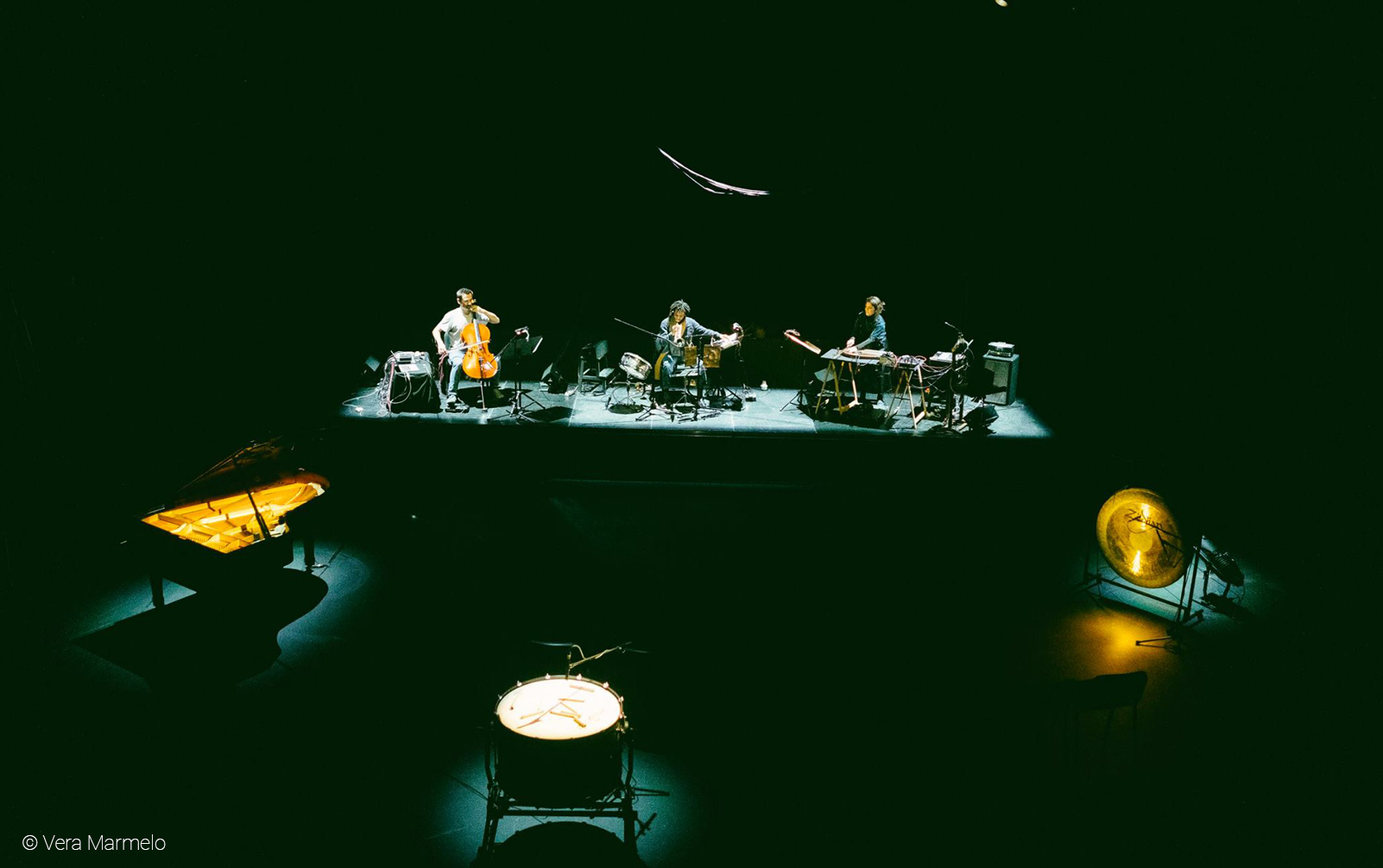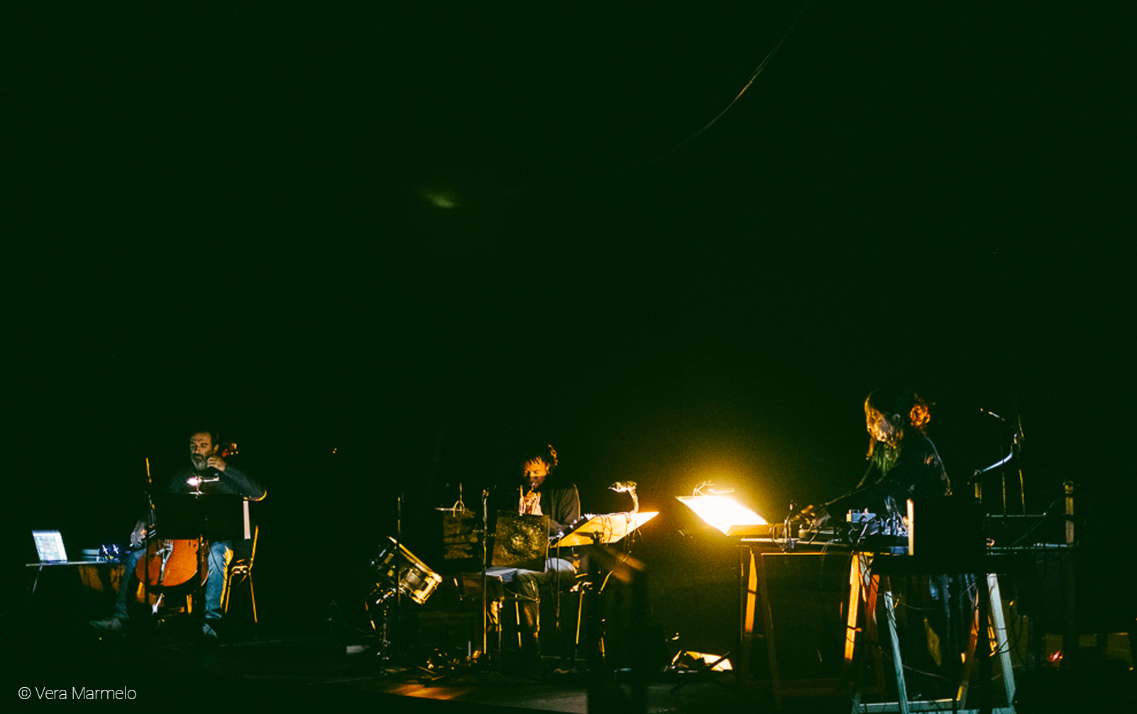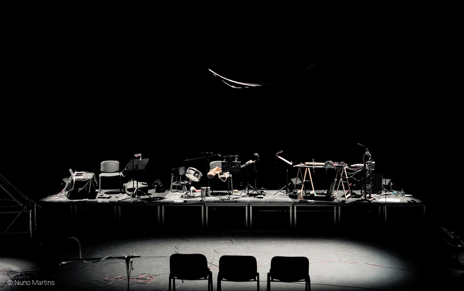 With a concept, score, interpretation, light design and space arrangement developed in collaboration, the work process is grounded on a common will: to discover a specific musical idiom with invented and modified instruments, while considering that music involves vision and space, beyond audition. The configuration of these instruments motivated the development of compositional strategies from each of the members. The work explores diverse ways of multiplying and confounding their identities, while shifting attention in-between performers, surrounding environment and other imaginary places. It drives perception through melodies of floating tonal centers, atonal moments, noisy dialogues and theatrical soundscapes.