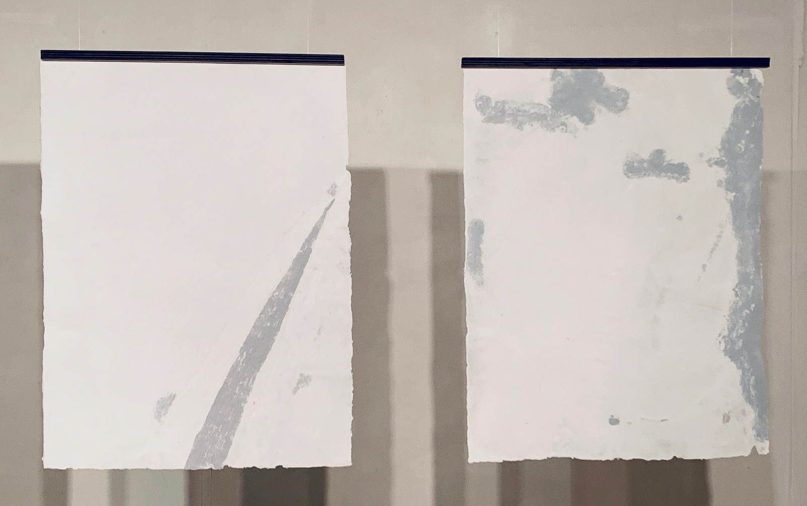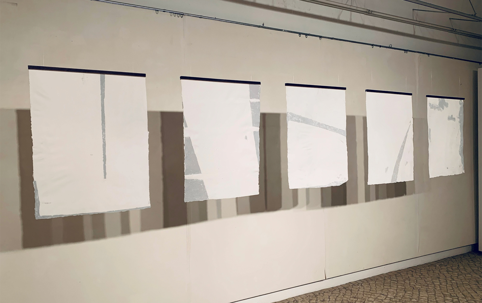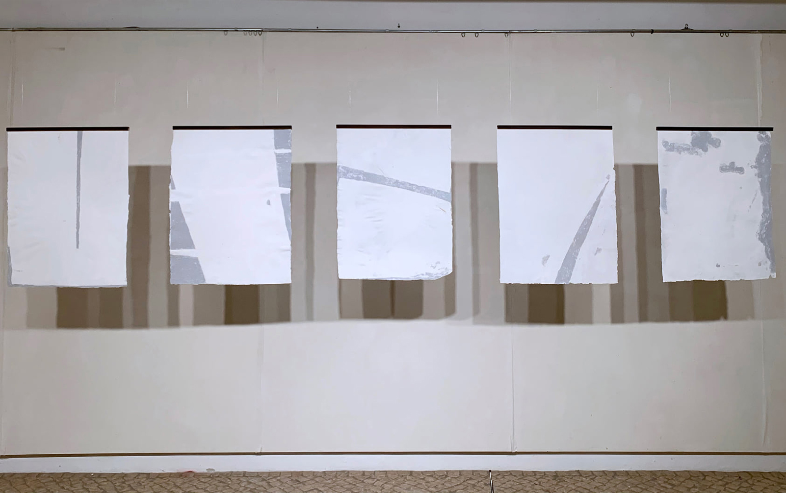 Cinco desenhos suspensos e um vídeo documental, explorando a fabricação manual do papel como meio de construção do desenho. Olhando para as técnicas artesanais e reciclando papel de algodão, estes desenhos são realizados com polpa de papel onde camadas de diferentes espessuras, textura e cor são trabalhados sobre a folha ainda húmida, permitindo “construir” o próprio papel. A folha deixa de ser somente um suporte, assumindo um carácter objectual e cinematográfico. Com estes desenhos Rita Thomaz tem experimentado diferentes dispositivos de exposição que permitem uma articulação maior entre a superfície do papel e o espaço envolvente.