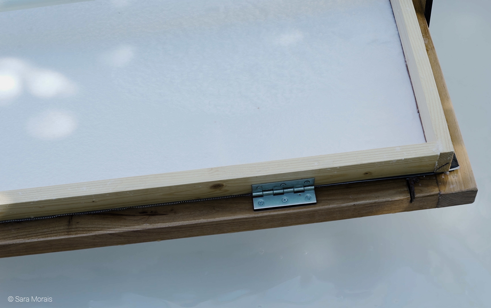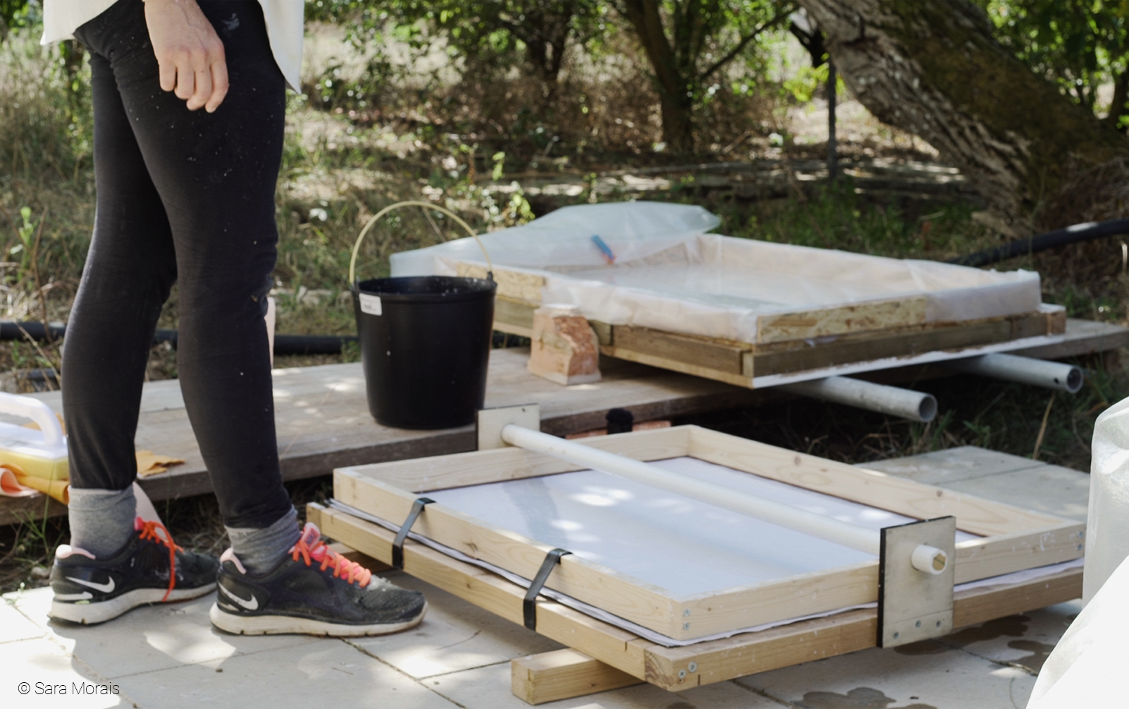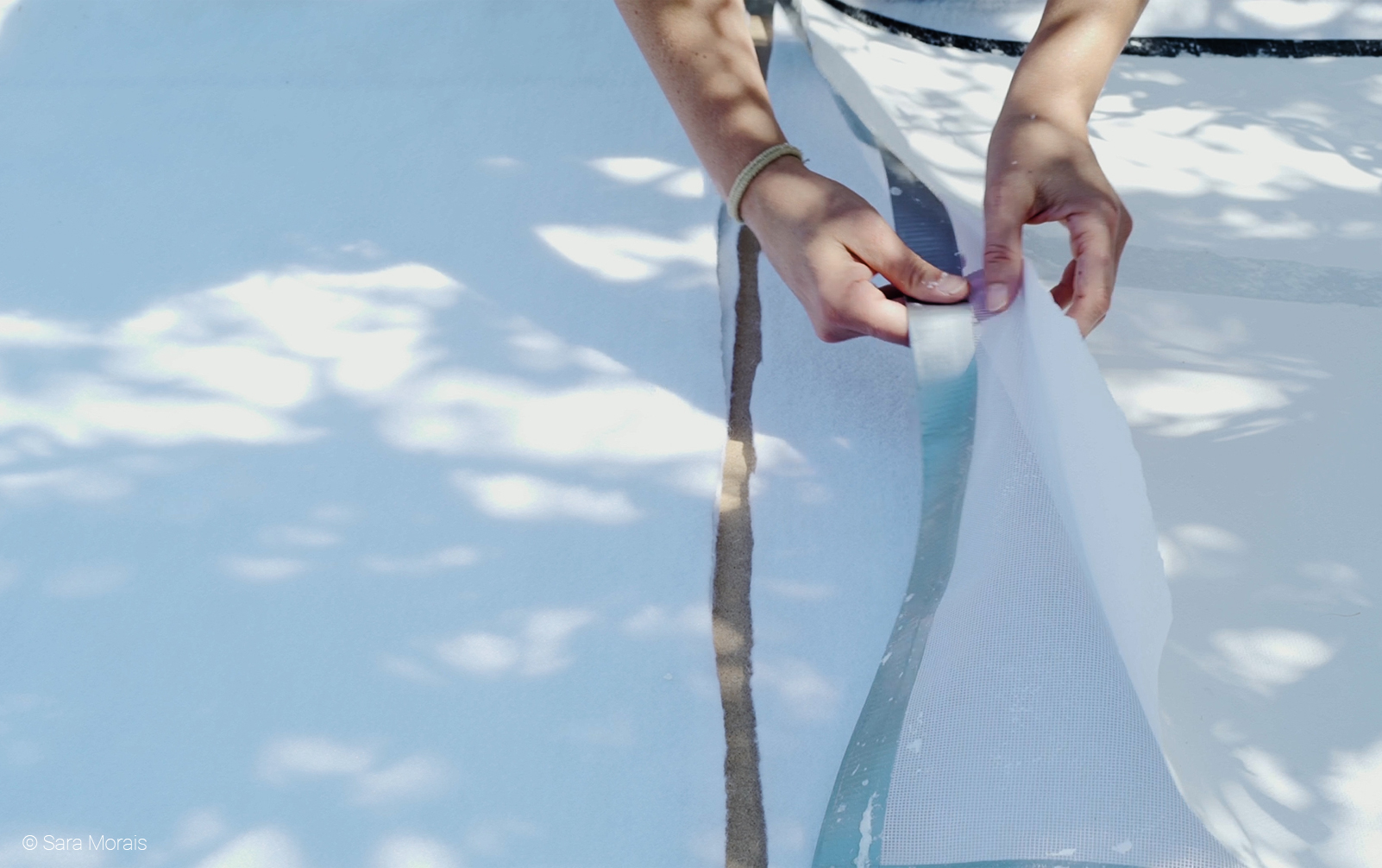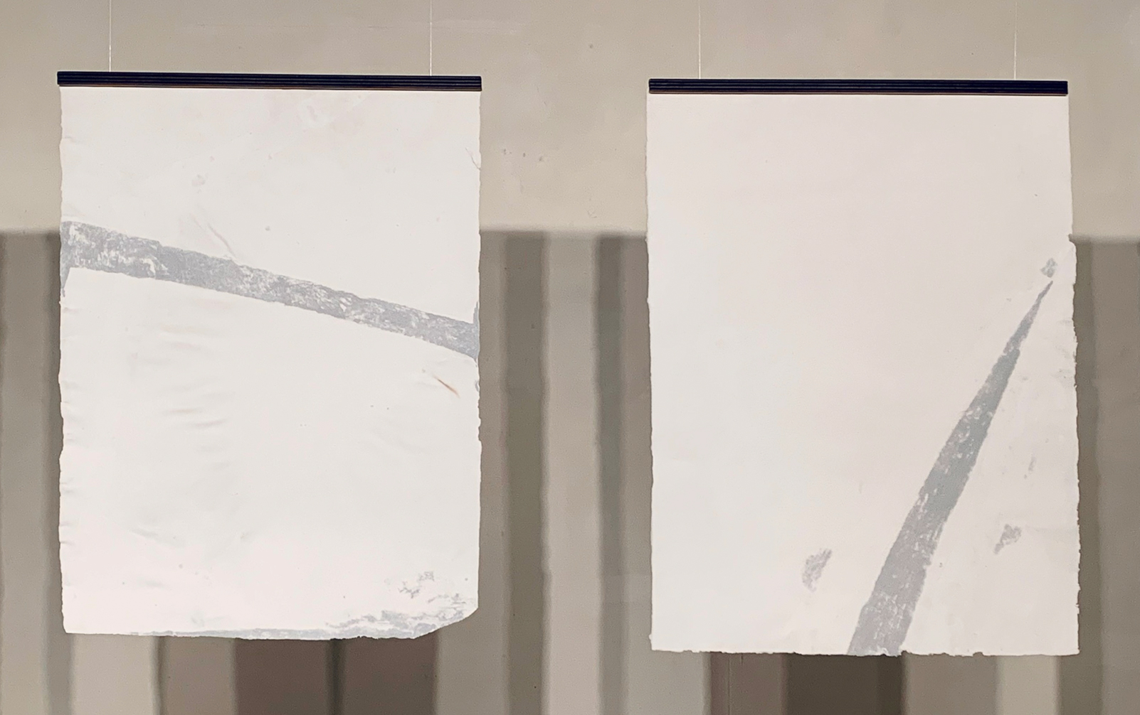 Cinco desenhos suspensos e um vídeo documental, explorando a fabricação manual do papel como meio de construção do desenho. Olhando para as técnicas artesanais e reciclando papel de algodão, estes desenhos são realizados com polpa de papel onde camadas de diferentes espessuras, textura e cor são trabalhados sobre a folha ainda húmida, permitindo “construir” o próprio papel. A folha deixa de ser somente um suporte, assumindo um carácter objectual e cinematográfico. Com estes desenhos Rita Thomaz tem experimentado diferentes dispositivos de exposição que permitem uma articulação maior entre a superfície do papel e o espaço envolvente.