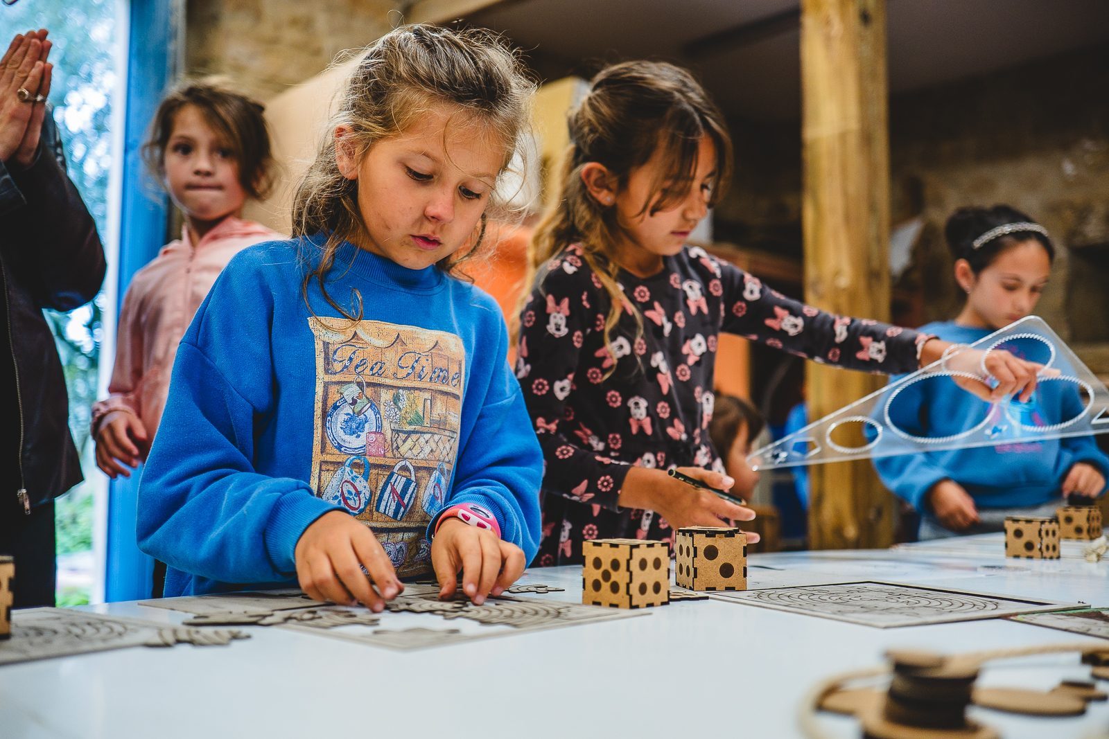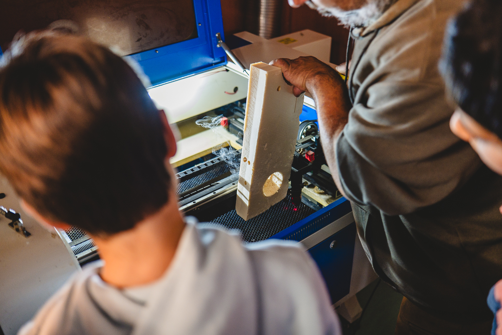 In the workshop Let’s Use Laser Beams!, children had the opportunity to explore the fascinating world of laser-based making. The excitement was immediate as they watched the laser cutting machine in action and, following simple instructions, began to create small objects that quickly took shape as dice, rockets, puzzles, and even a cardboard head assembled on the spot with the participants’ help.