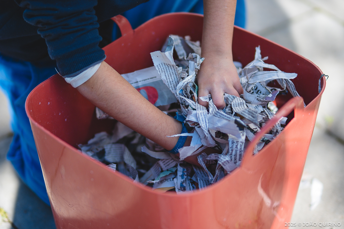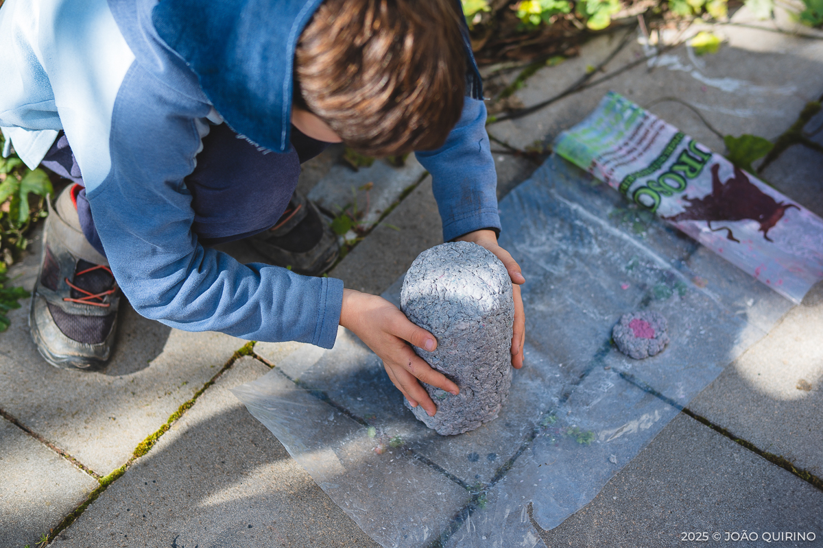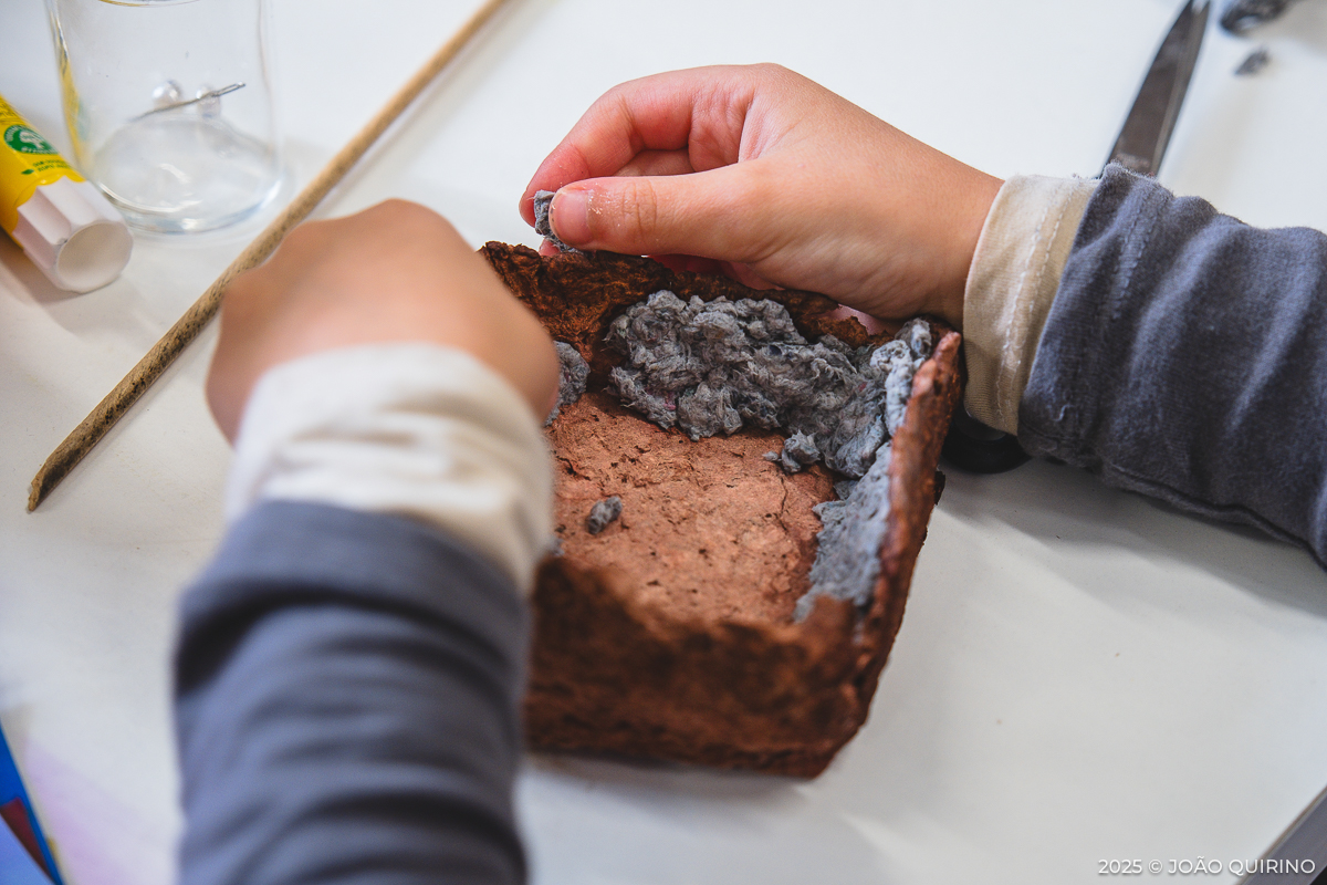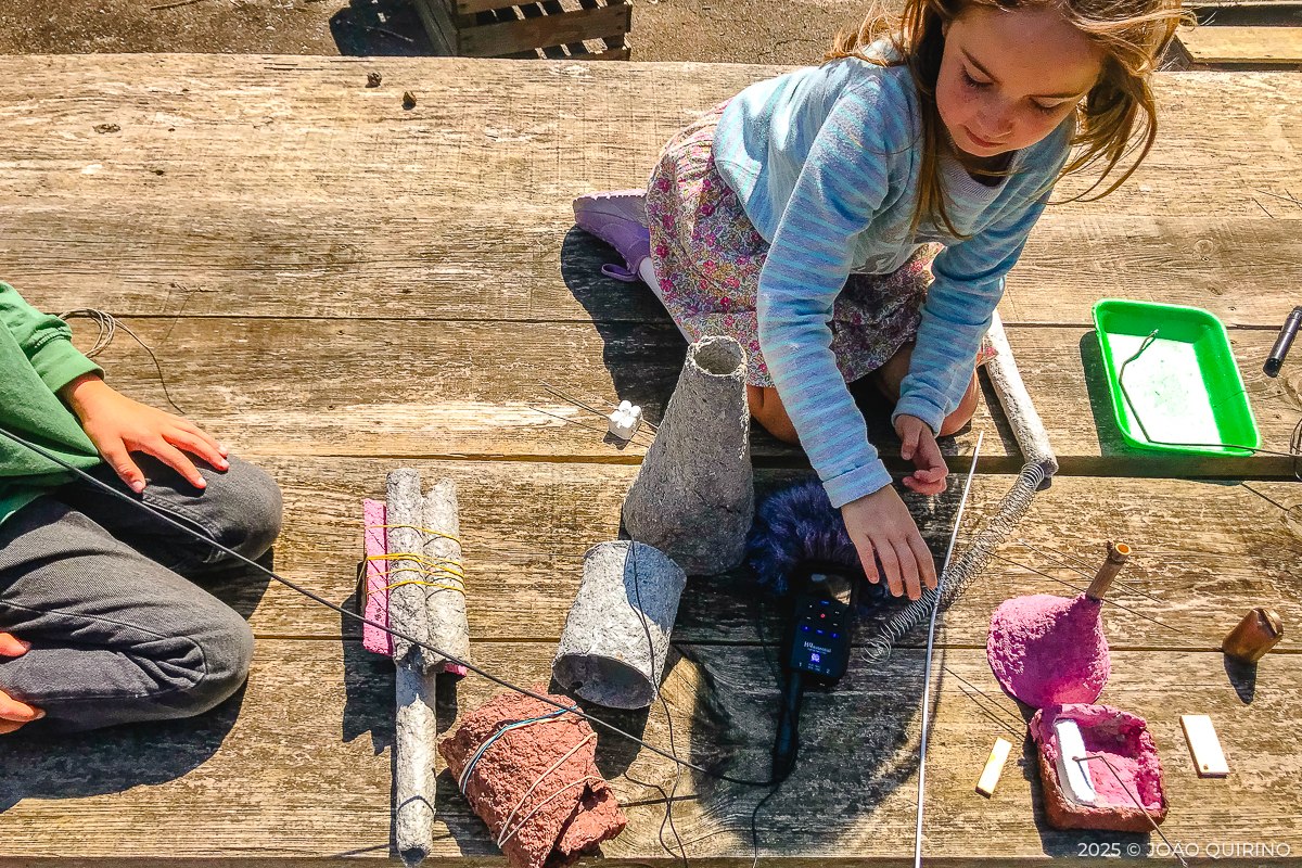 As crianças tiveram à sua disposição um mundo de possibilidades para a construção de instrumentos musicais experimentais. A partir de pasta de papel, criaram instrumentos, utensílios e apetrechos originais, que depois foram explorados em composições e experiências sonoras únicas.