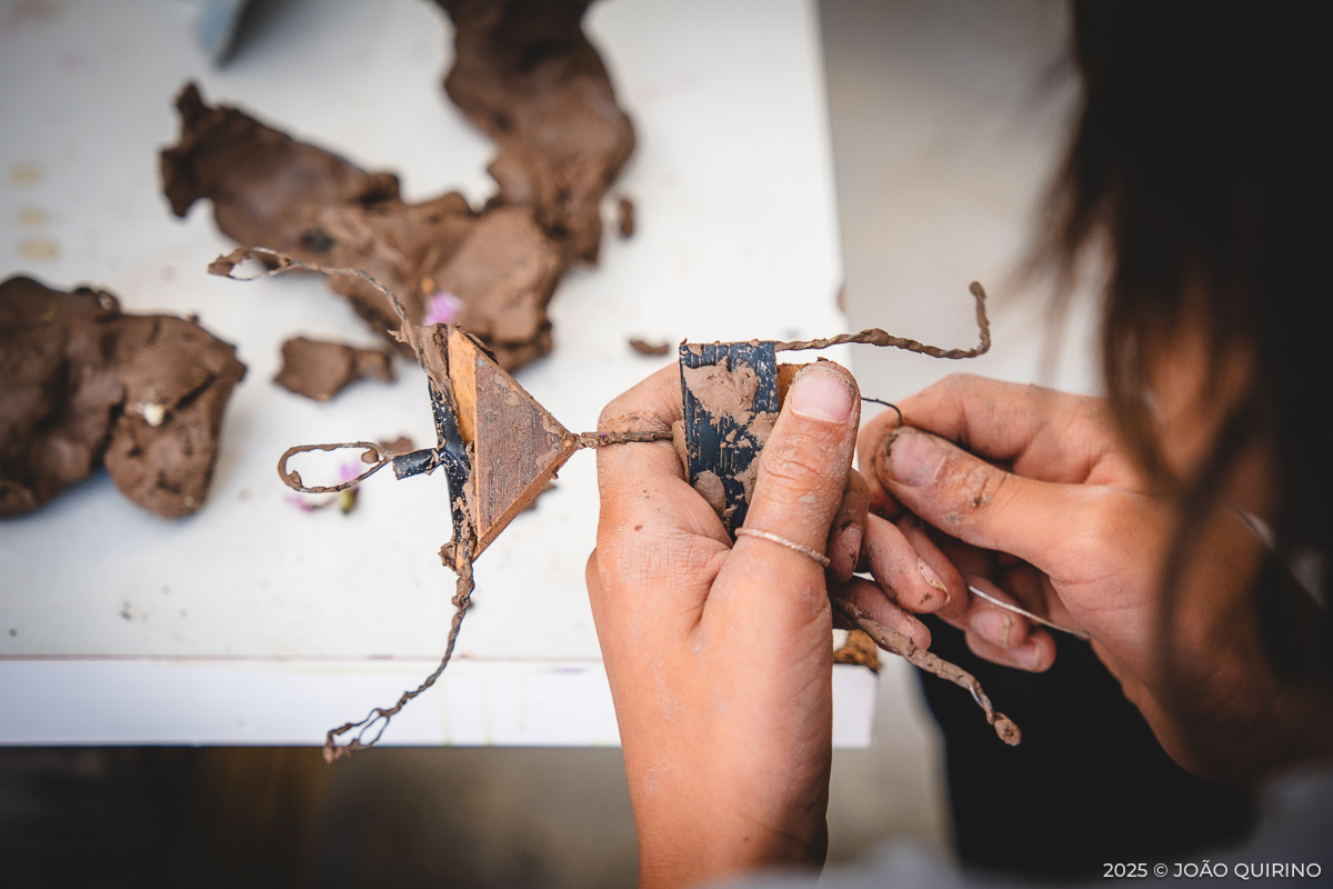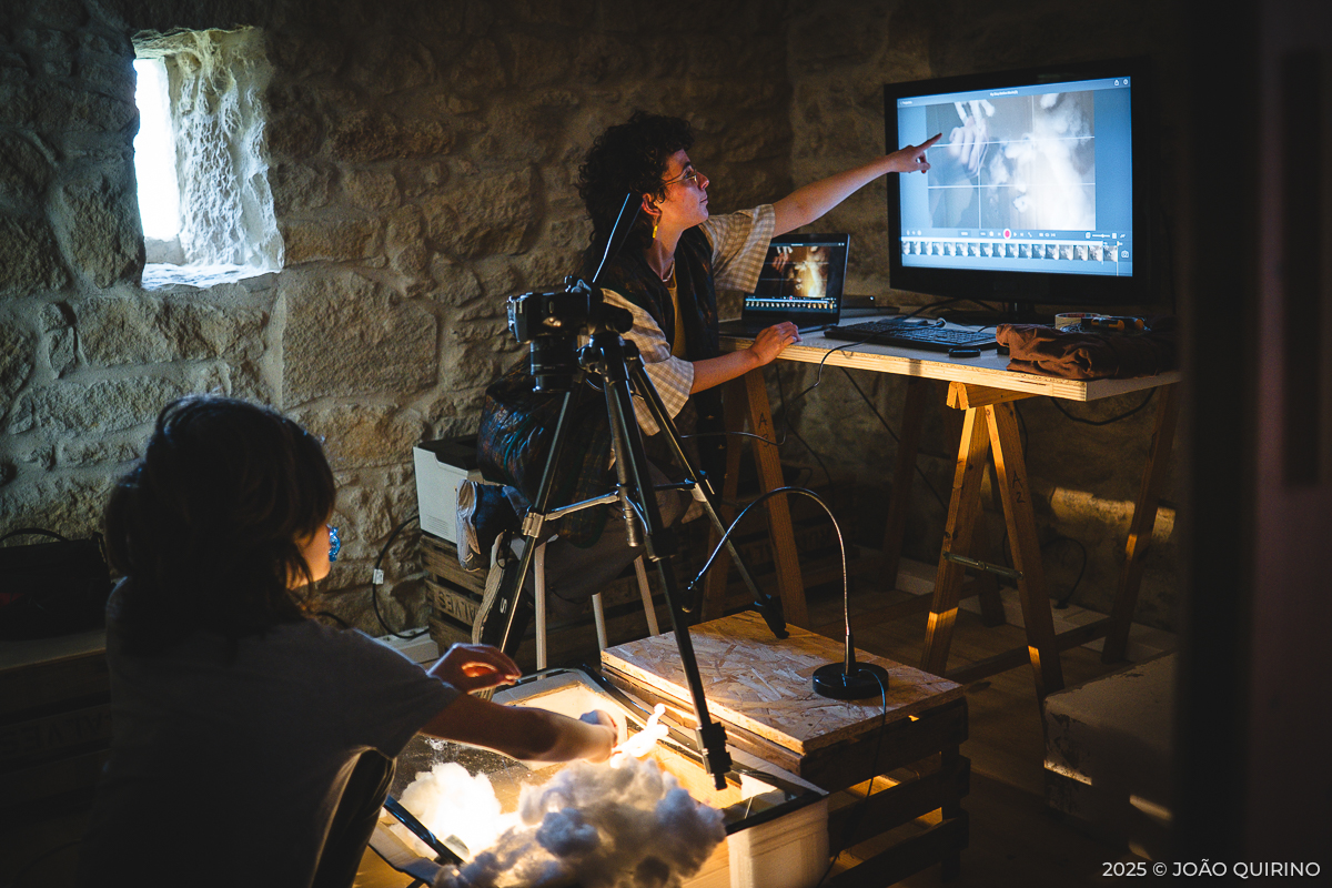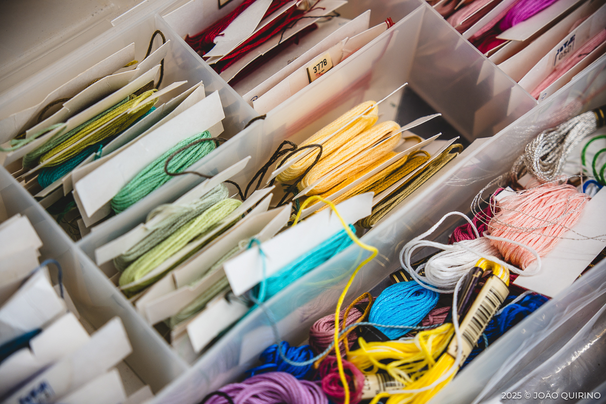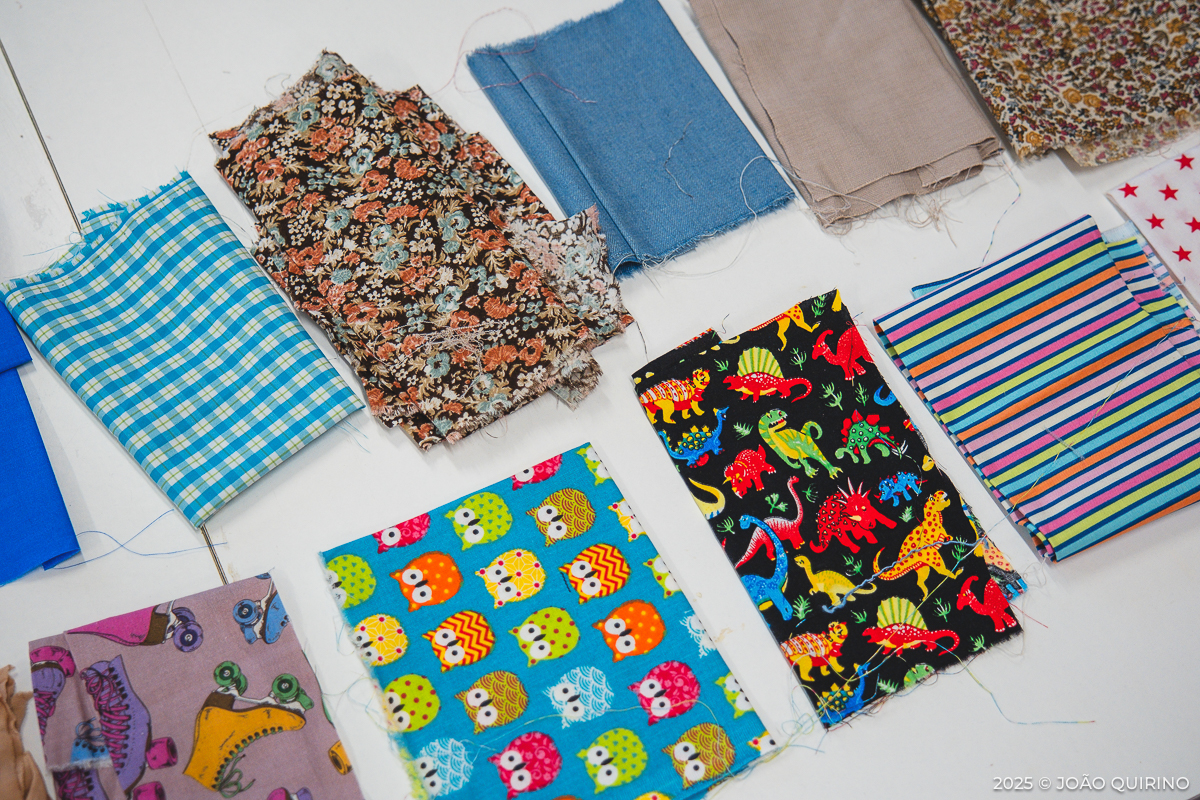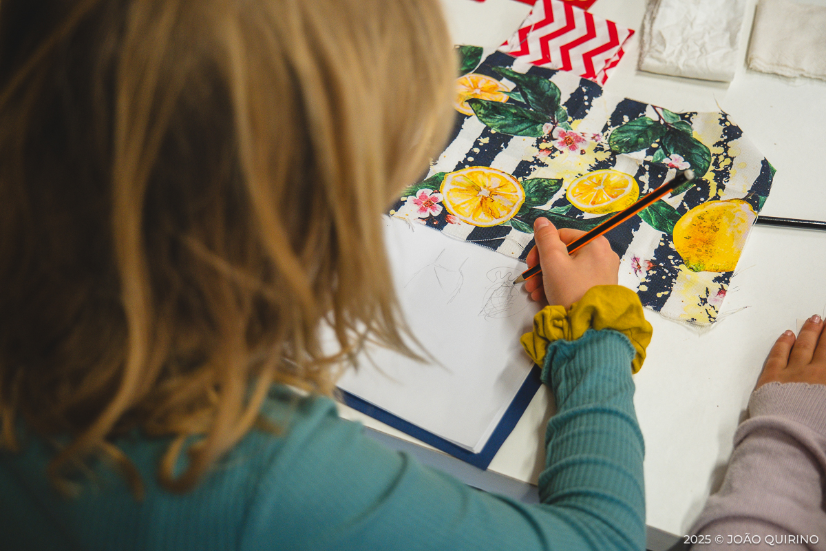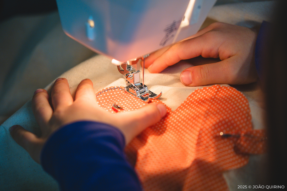 Aqui, as crianças puderam experimentar e criar dentro do universo dos têxteis: costura manual, bordados, construção de objetos e até o uso básico da máquina de costura. Estas práticas cruzaram-se com serigrafia, gravura e tinturaria, acrescentando ainda a exploração de possibilidades interativas de programação e eletrónica.