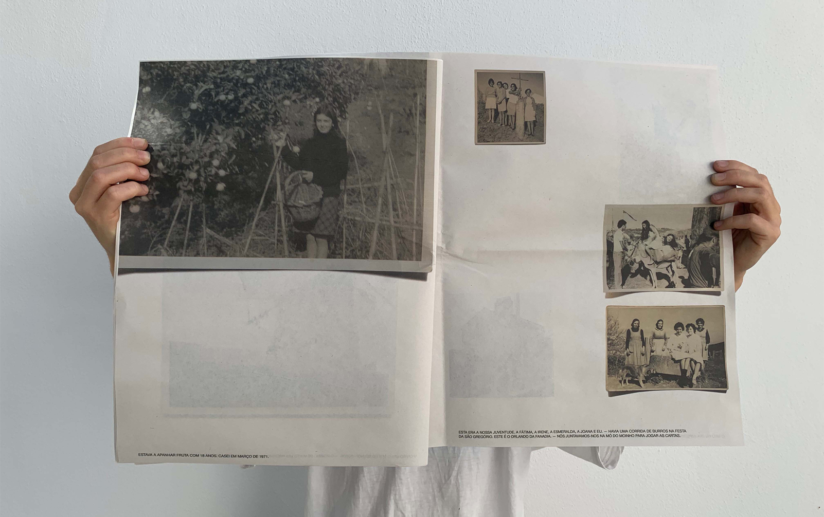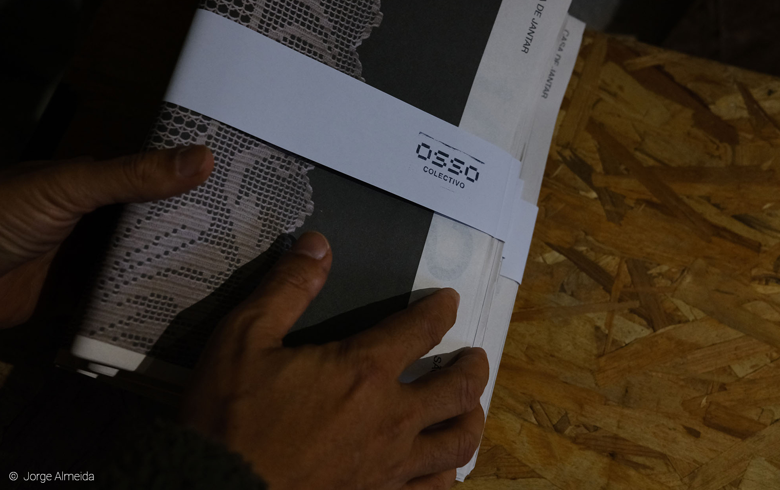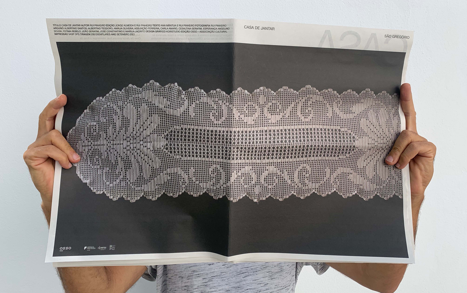 “O projeto Casa De Jantar surgiu do convite da OSSO para a realização de uma residência de criação em torno da fotografia. A proposta, desenvolvida na aldeia de São Gregório, tinha como premissa envolver a comunidade e trabalhar com fotografia a história deste território. O formato escolhido combina arquivo fotográfico familiar com fotografia de autor, concebendo uma nova ordem narrativa. Aqui, são apresentadas, de forma impressa, imagens dos anos 30 do século passado até aos dias de hoje. Este processo gerou inúmeras ligações entre espaços e pessoas, entre o tempo e a sua ausência. A fotografia presta um serviço fundamental à memória, uma vez que projeta a reminiscência de um passado do qual já poucas recordações guardávamos. «Não é por acaso que Warburg dizia que o seu Bilderatlas, um atlas de imagens a que deu o nome de deusa da memória, composto por 63 painéis, onde tinha fixado mais de 1000 imagens, era uma história de fantasmas para adultos. As imagens que Sebald integra nos seus livros não são ilustrações, são vestígios de um passado que regressa, formas materializadas de aparições fantasmáticas que se inserem num materialismo espectral mais vasto.» [1]